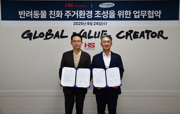 HS화성은 24일 본사 5층 회의실에서 HS화성 이종원 회장과 펫퍼블릭 남정우 대표 등이 참석한 가운데, ‘반려동물 친화 주거환경 조성’을 위한 업무협약(MOU)을 체결했다고 밝혔다