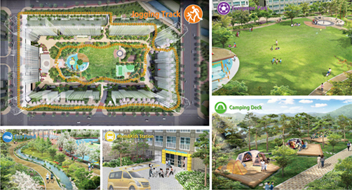 - 아파트라는 주거공간에서 아이들이 생활하고 뛰어놀면서 즐기고 배울 수 있는 다양하고 안전한 학습, 놀이공간을 마련하였다. 주차장을 전면 데크화하여 단지 중앙에 넓은 잔디광장 을 구성, 안전하고 쾌적한 단지를 마련하였고, 이를 통해 데크상부에 다양한 놀이공간 학습공간, 편의공간을 제공하였다.