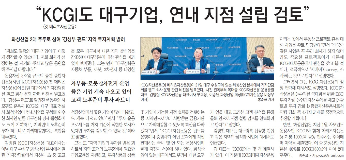 화성산업 2대 주주로 참여 '강성부 펀드' 지역 투자계획 밝혀 ![]() "저희도 일종의 '대구 기업이다' 이렇게 생각할 수 있습니다. 저희 회사가 성장하는 걸 지켜봐 주시고 많은 응원을 해 주시길 바랍니다." 운용자산 3조원 규모의 중견 종합자산운용사인 KCGI자산운용(옛 메리츠자산운용)이 21일 대구에서 기자간담회를 열고 회사 운영 관련 비전을 발표했다. '강성부 펀드'로 알려진 행동주의 사모펀드 운용사 KCGI와 대구 대표 건설사 화성산업이 컨소시엄을 구성해 인수한 회사인 만큼 대구경북 경제 활성화에도 크게 기여하고, 지역민의 노후준비 투자 파트너로 자리매김한다는 복안을 내놓았다.